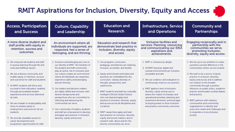Alongside this I was selected to represent students across the campus-wide IDEA framework (Inclusion, Diversity, Equity and Access) deployment, involving regular committee meetings with fellow student leaders, educational directors and VC's. This project was scoped to impact 90,000 students yearly, and directly impacted funding and resource allocation across RMIT Melbourne campuses.